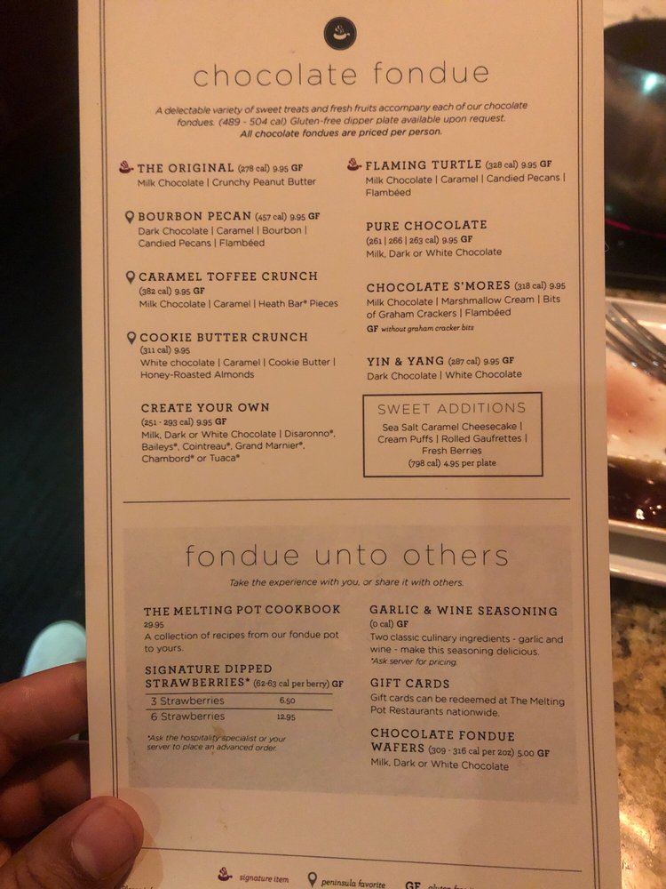 Small: $35. A smoking mountain of chocolate fondue is topped with cake, cotton candy and fireworks for the ultimate (photo-worthy) indulgence. Choose between: Raspberry Dark Chocolate Fondue topped with Red Velvet Cake (450 cal per serving); Birthday Cake White Chocolate Fondue topped with Confetti Cake (450 cal per serving)